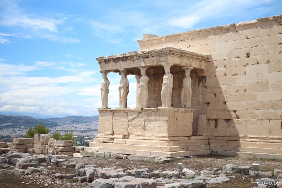 Отдельно стоит отметить портик кариатид у южной стороны Эрехтейона. Изначально конструкция включала в себя 6 мраморных женских статуй высотой 2,3 метра. Но уже не безызвестный Томас Элгин, умыкнул одну статую, а пять оставшихся заменили на копии, отправив оригиналы в музей Акрополя.