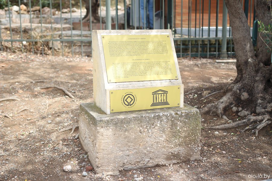 Знак-табличка сообщающая, что Афинский Акрополь с 1997-ого года находится в списке всемирного наследия ЮНЕСКО.