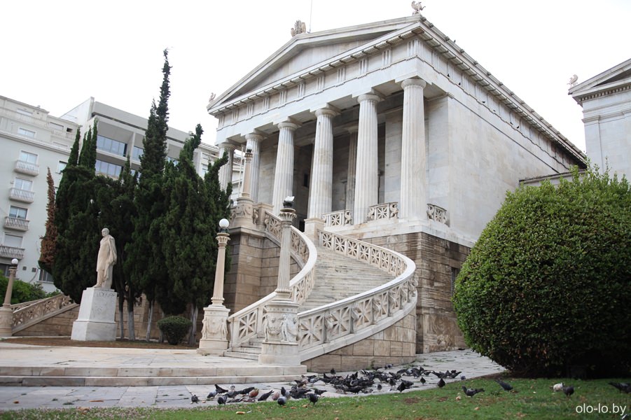 Замыкает тройку зданий, которые принято называть неоклассической «Афинской трилогией» — Национальная библиотека Греции. Здание построено в 1888-ом году. Сейчас с фондах библиотеки храниться более 2 миллионов единиц книг и другой печатной продукции.
