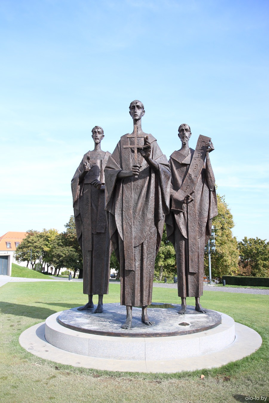 А рядом с ними бронзовая скульптура Святых Кирилла и Мефодия установленная в 1990-ом году.