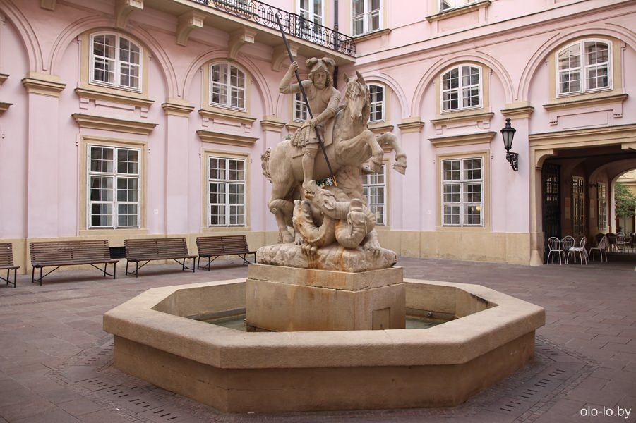 Во внутреннем дворике установлен фонтан Георгия Победоносца.