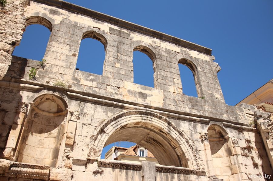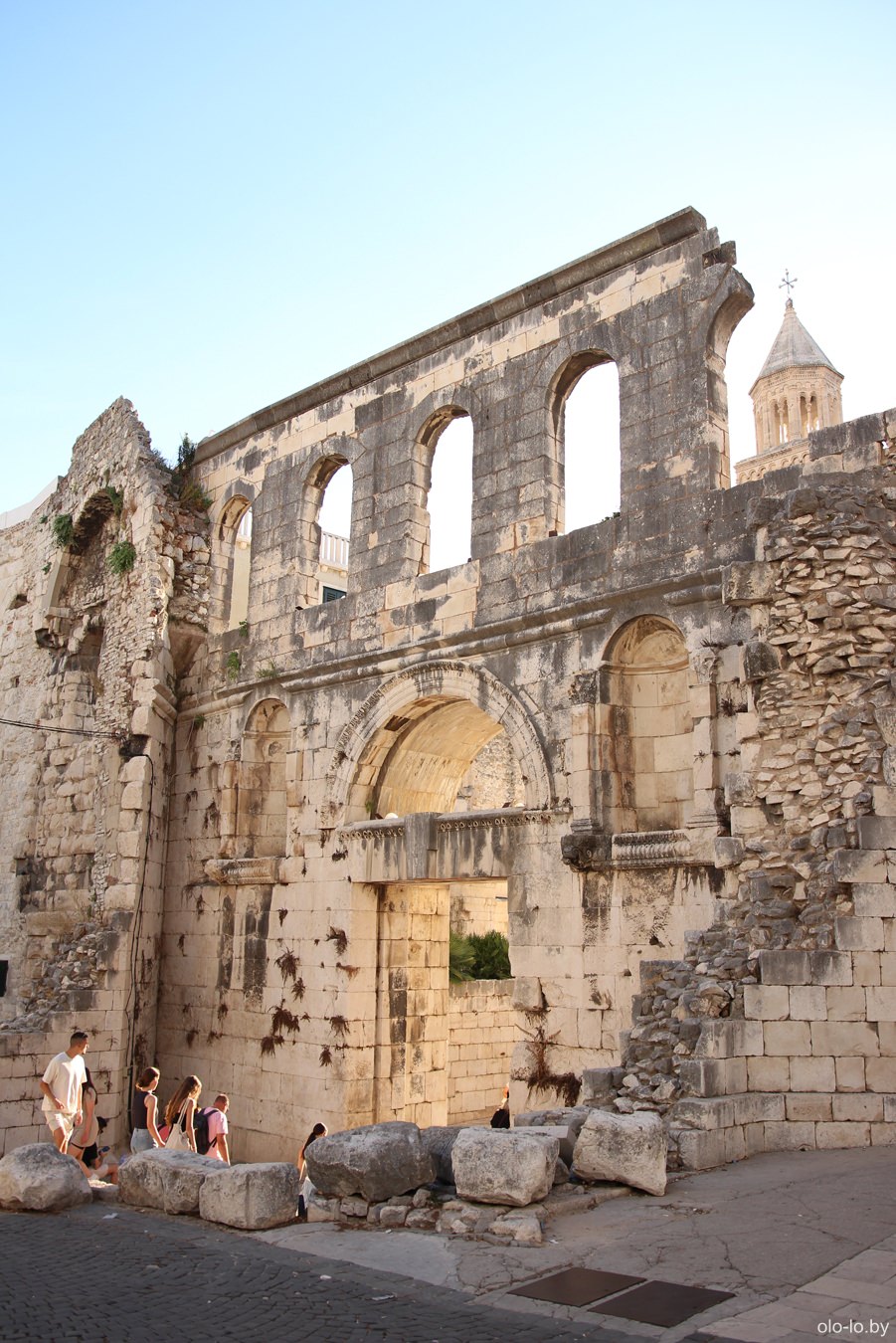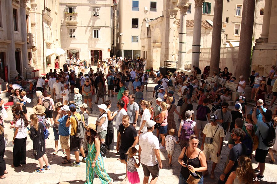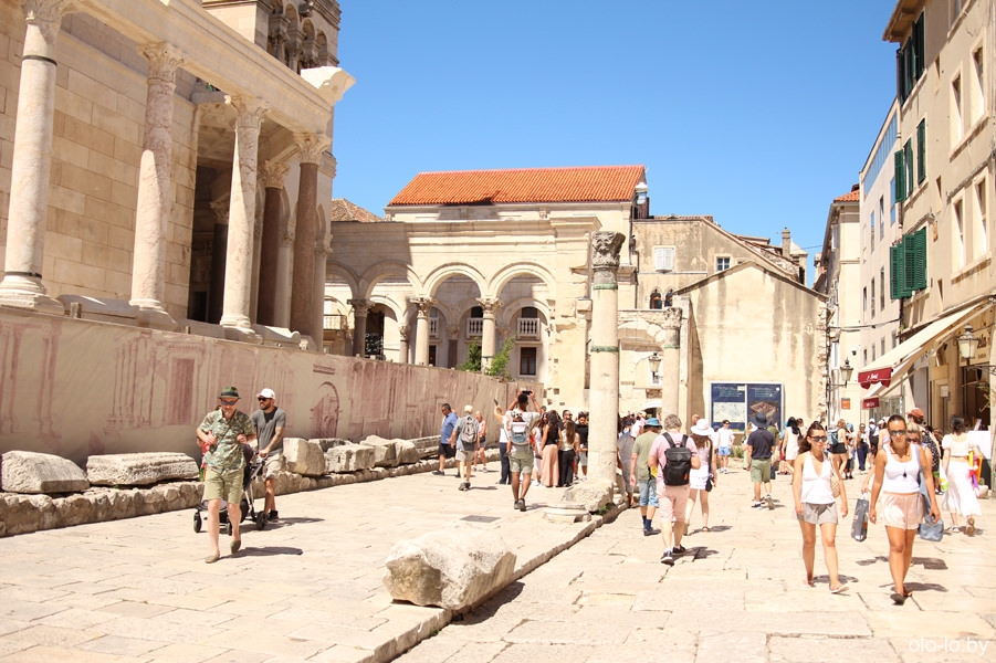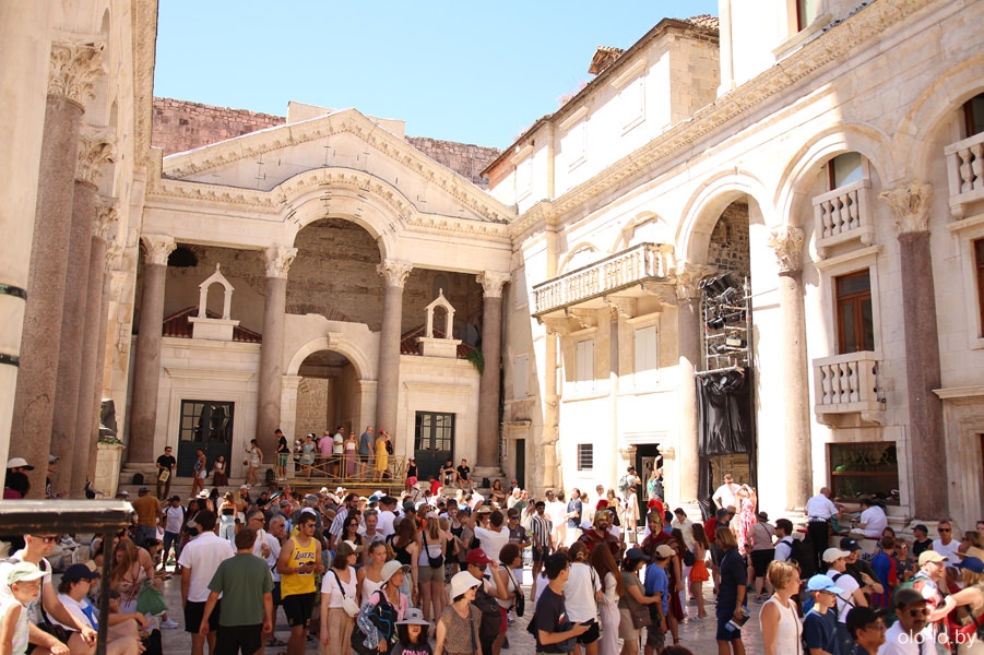 Пройдя через арку попадаем на территорию дворца Диоклетиана. Сам дворец строился, как личная резиденция императора на стыке 3 и 4-ого веков, а в последствии стал прародителем Сплита, постепенно прирастая постройками за пределами крепостной стены. Дворец Диоклетиана вместе с историческими зданиями Старого города включен в список Всемирного наследия ЮНЕСКО. Днем здесь многолюдно.