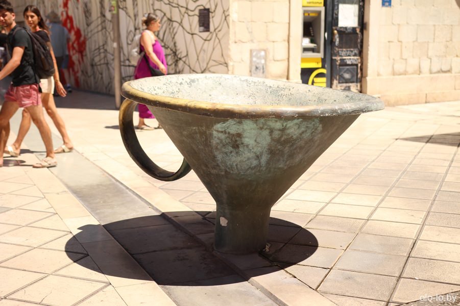 Фонтан «Фига и пирия» представляющей собой бронзовую чашу и кукиш на стене рядом из которого должна струиться вода. Но в день когда мы были, а может и вообще, фонтан не работал.