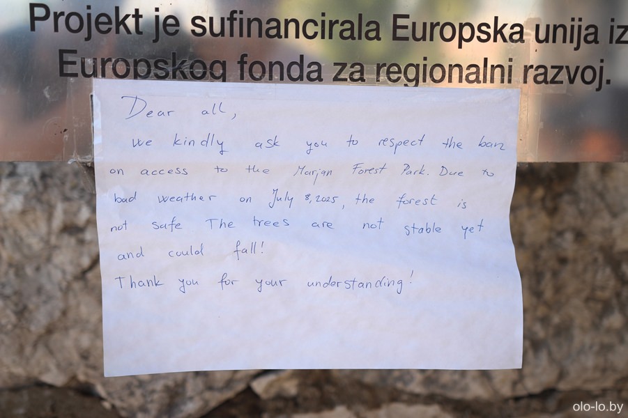 Вход в сам парк Марьян был закрыт, так как за неделю до нашего визита в Сплите разбушевался ураган поваливший много деревьев и причинивший ущерб зданиям.