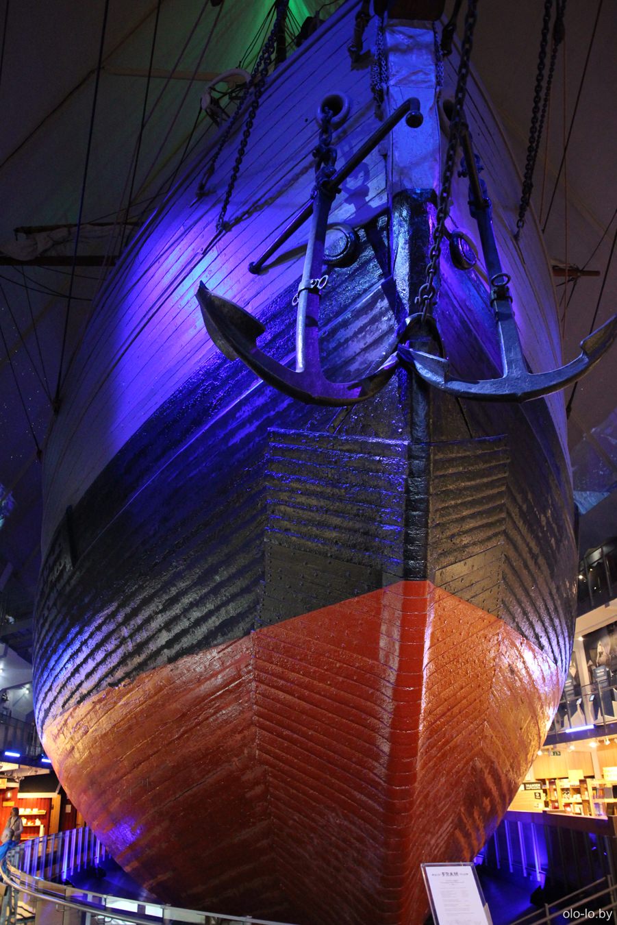 Деревянный парусно-моторный корабль «Фрам» введен в эксплуатацию в 1893-ем году. Судно занимает почти всю площадь музея, оставляя лишь по бокам небольшие полости с различными экспонатами.